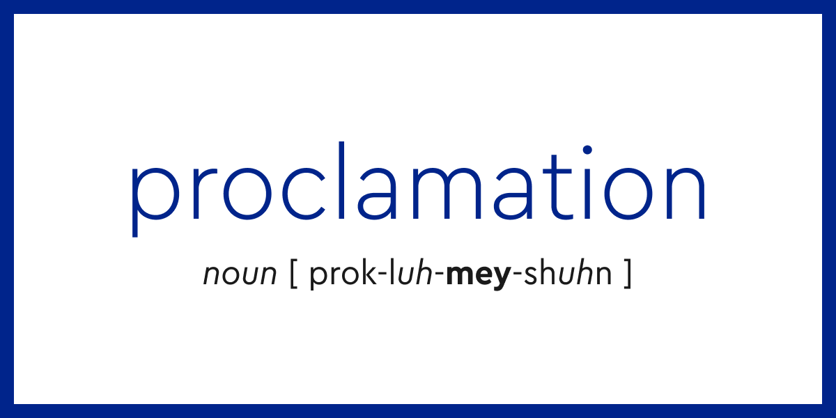 Proclamation - 10 answers | Crossword Clues We found 10 answers for "Proclamation" . This page shows answers to the clue Proclamation, followed by ten definitions like " The act of proclaiming ", " The act of proclaiming " and " A proclamation (Lat ". Synonyms for Proclamation are for example act, announcement and command. More synonyms can be found below the puzzle answers.